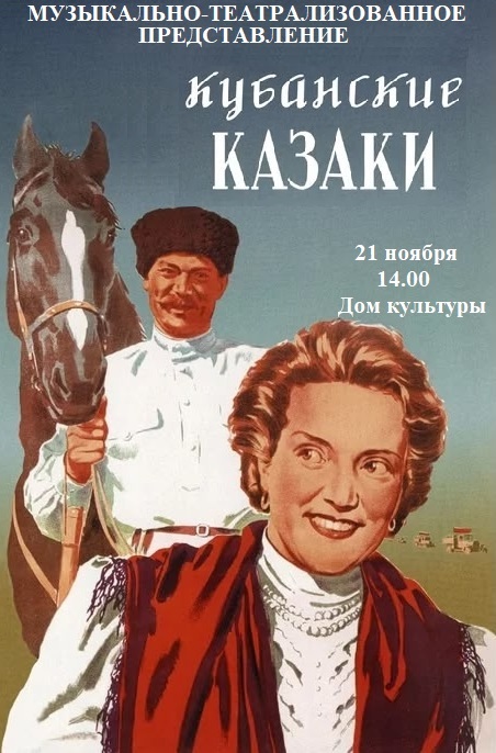 21 ноября в 14.00 в актовом зале Дома культуры состоится показ музыкально-театрализованного представления «Кубанские казаки», приуроченный ко Дню работников сельского хозяйства и перерабатывающей промышленности.