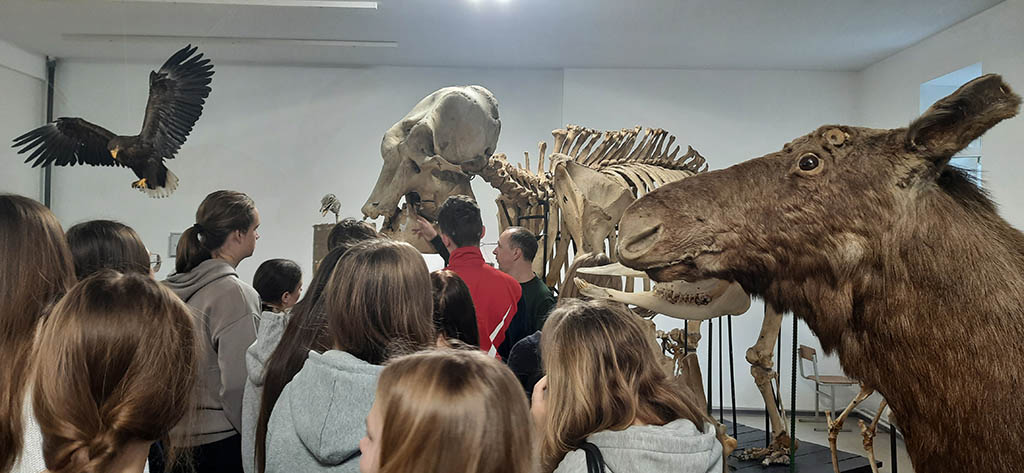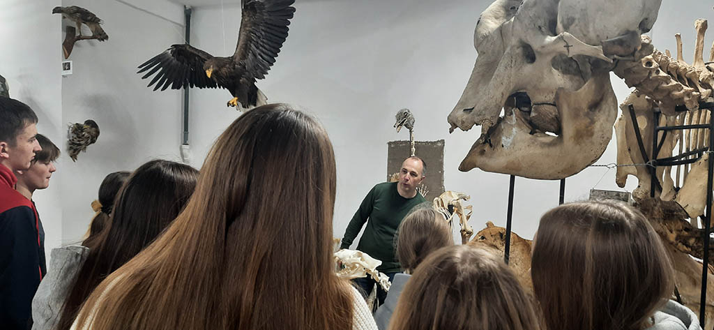 14-15 ноября 2025 г. кафедрой социально-гуманитарных наук УО ВГАВМ была организована экскурсия для учащихся 9-11 классов ГУО «Озерицкослободская средняя школа» Смолевичского района Минской области. 14 ноября гости посетили учебный зоотеррариум кафедры зоологии, о питомцах которого школьникам рассказала заведующий кафедрой, кандидат биологических наук Миклашевская Елена Викторовна. На следующий день гости из Смолевичского района побывали в музее кафедры анатомии животных, экскурсию в котором провел заведующий кафедрой, кандидат ветеринарных наук, доцент Лях Александр Леонтьевич, и посетили кафедру паразитологии и инвазионных болезней животных, где старший преподаватель Бородин Юрий Александрович познакомил школьников с уникальными экспонатами музея кафедры. Учащиеся из Смолевичского района с большим интересом слушали сотрудников УО ВГАВМ, задавали вопросы, а после экскурсионной программы живо обсуждали увиденное.