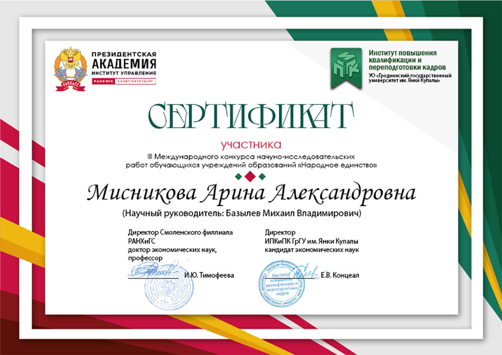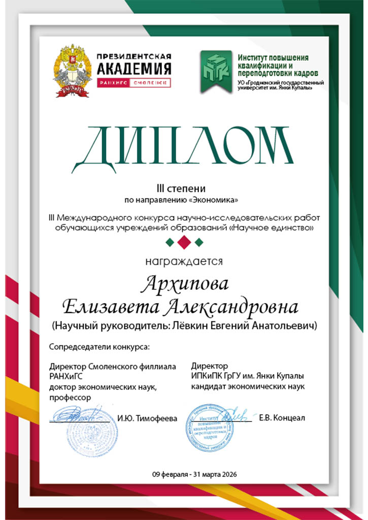 В конкурсе, который проходил с 9 февраля по 31 марта 2026 г., приняли участие свыше 140 студентов. К сожалению, высокий уровень конкуренции, особенности начисления зачетных баллов и другие статьи условий конкурса не позволили добиться желаемых, максимально возможных результатов. Но в данном случае, главное – это участие, а победы в будущем обязательно придут. Тем не менее из трех поданных на конкурс работ от кафедры экономики и информационных технологий (заведующий кафедрой, доцент, кандидат с.-х. наук М.В. Базылев) две получили сертификаты: студентка Приставко Ульяна Сергеевна – с работой «Антикризисный план производства продукции животноводства в агрохозяйстве ОАО «Жабинковский» (научный руководитель – доцент кафедры В.В. Линьков) , студентка Мисникова Арина Александровна – с работой «Перспективные пути совершенствования одного из флагманов Витебского животноводства ОАО «Шайтерово» (научный руководитель – доцент, заведующий кафедрой М.В. Базылев). Работа студентки Архиповой Елизаветы Александровны «Факторная стратегия экономической эффективности молочного скотоводства в крупнотоварных агропредприятиях» (научный руководитель – доцент кафедры Е.А. Левкин) была удостоена диплома III степени по направлению «Экономика».