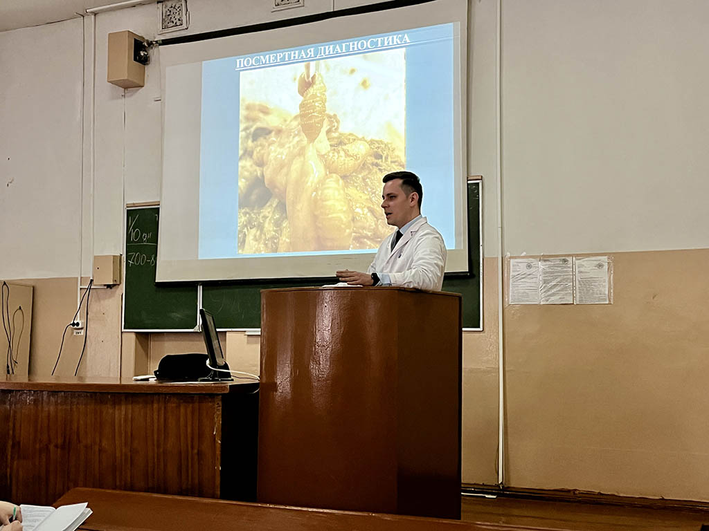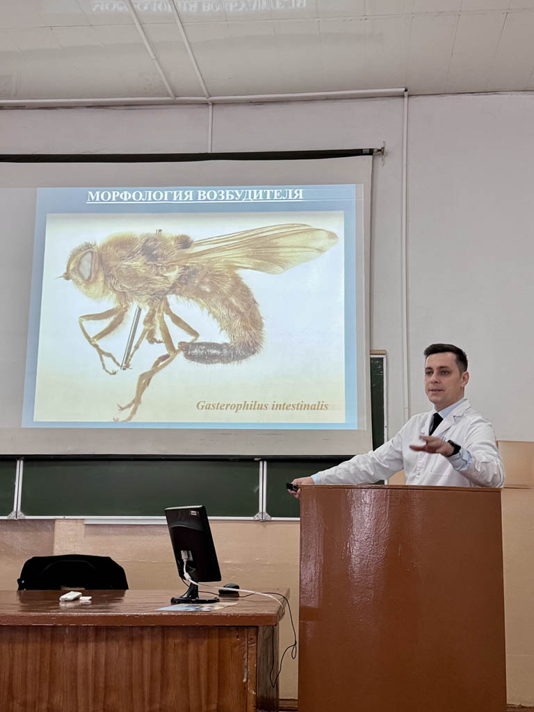30 апреля 2026 года состоялась открытая лекция доцента кафедры паразитологии и инвазионных болезней животных Соловьёва А.В. для студентов 4-го курса ФВМ (дневная форма получения образования) по учебной дисциплине «Паразитология и инвазионные болезни» на тему «Гастерофилез лошадей. Эстроз овец. Ринэстроз лошадей».