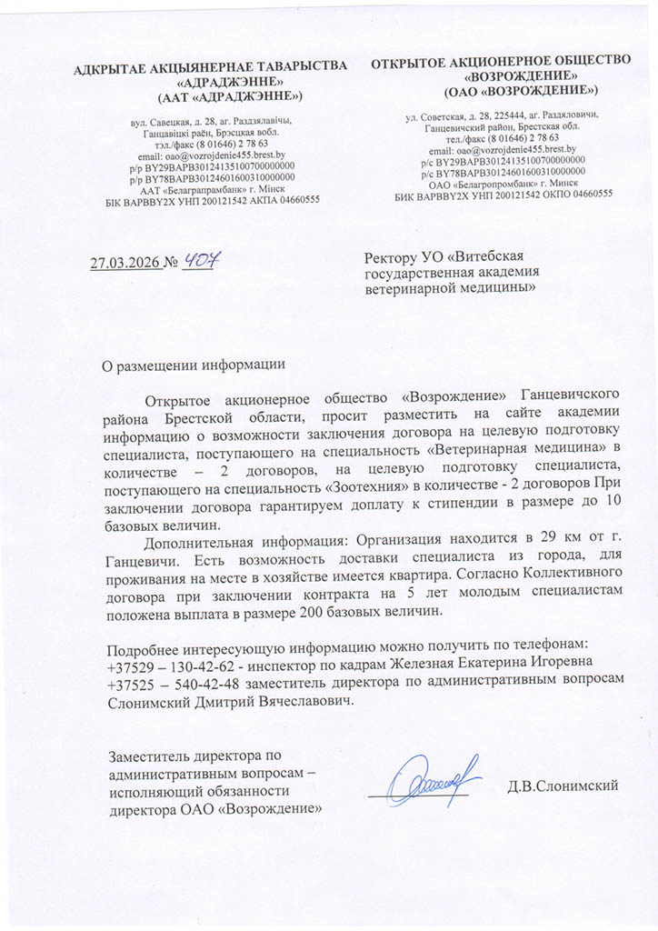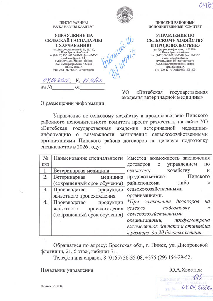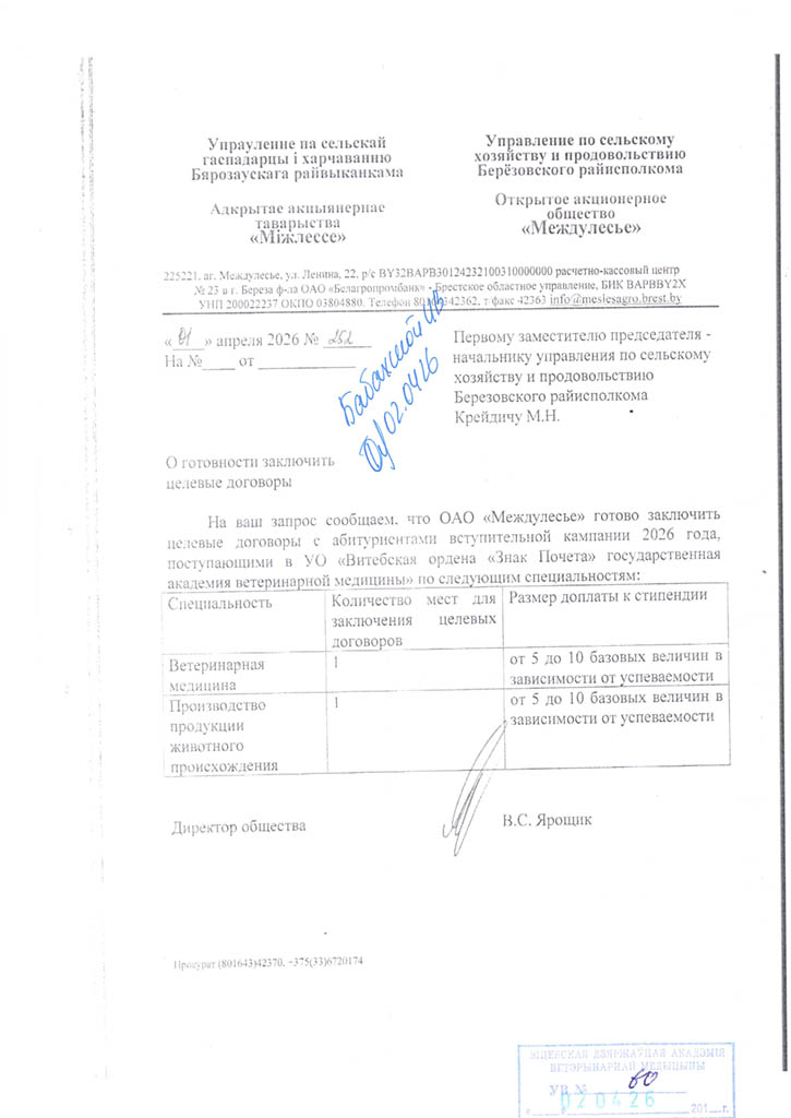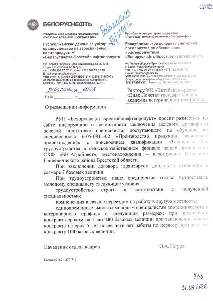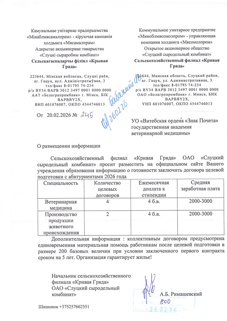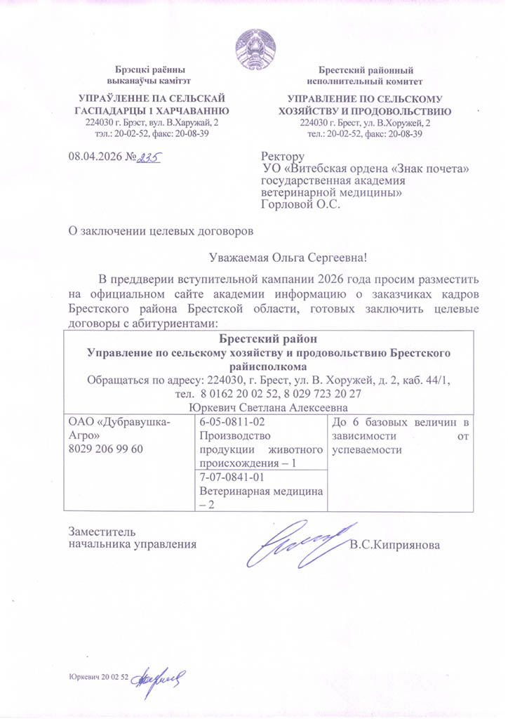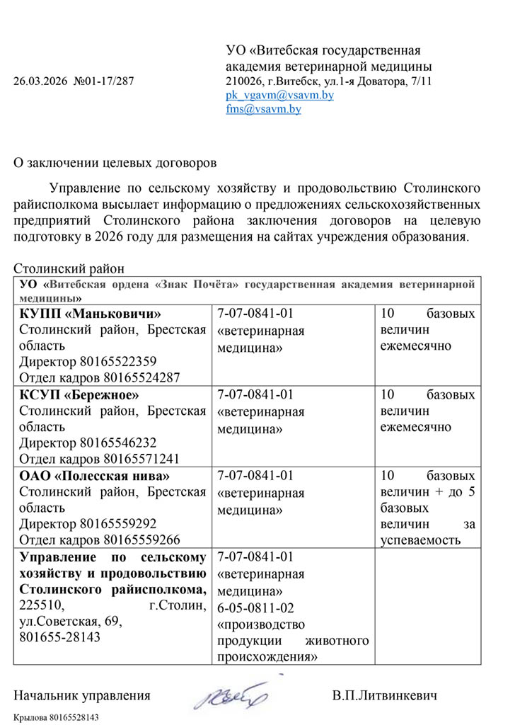 Районные (городские) призывные комиссии решение о призыве на срочную военную службу или службу в резерве молодых специалистов (рабочих, служащих), направленных на работу в организации агропромышленного комплекса Витебской области в соответствии с договором о целевой подготовке специалиста (рабочего, служащего), принимают с учетом ходатайства Витебского облисполкома о призыве таких специалистов (рабочих, служащих) на службу в резерве (Указ Президента Республики Беларусь от 25.02.2020 №70 «О развитии агропромышленного комплекса в Витебской области»).
