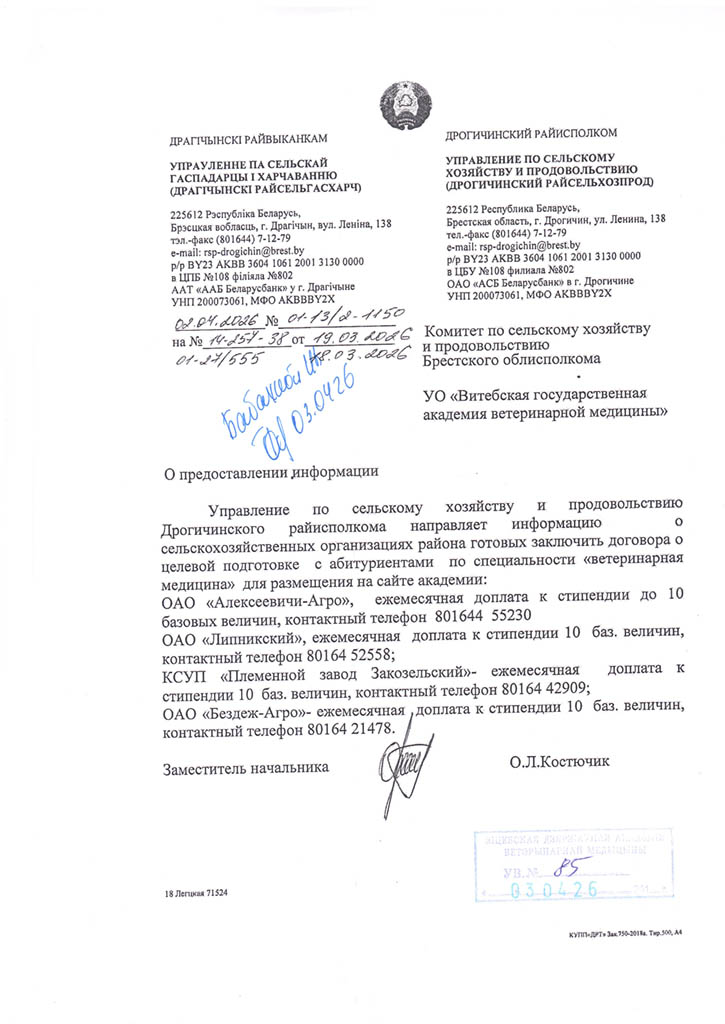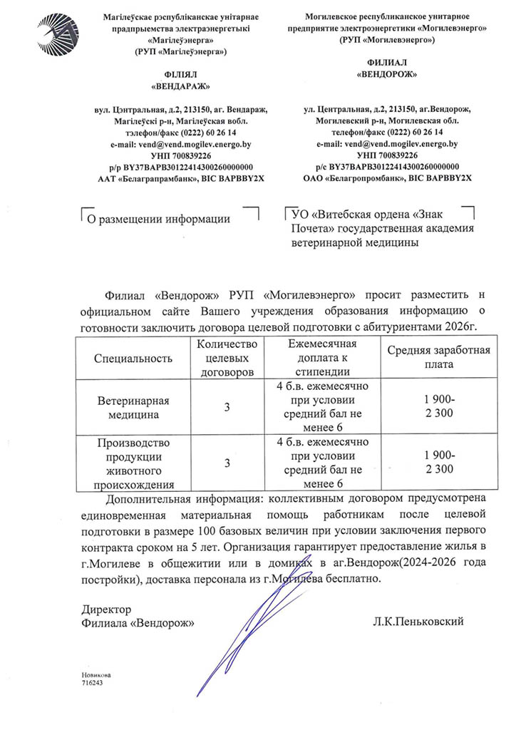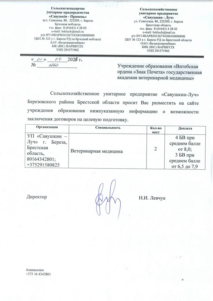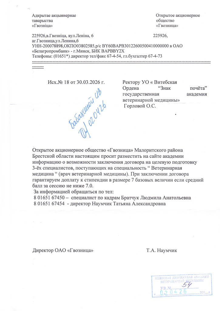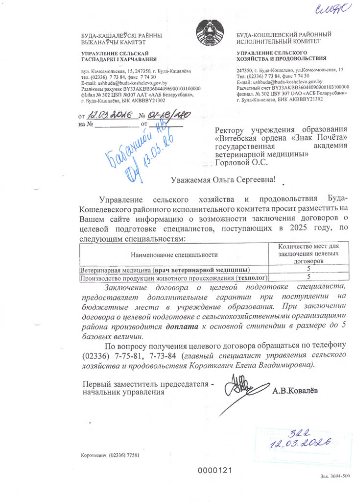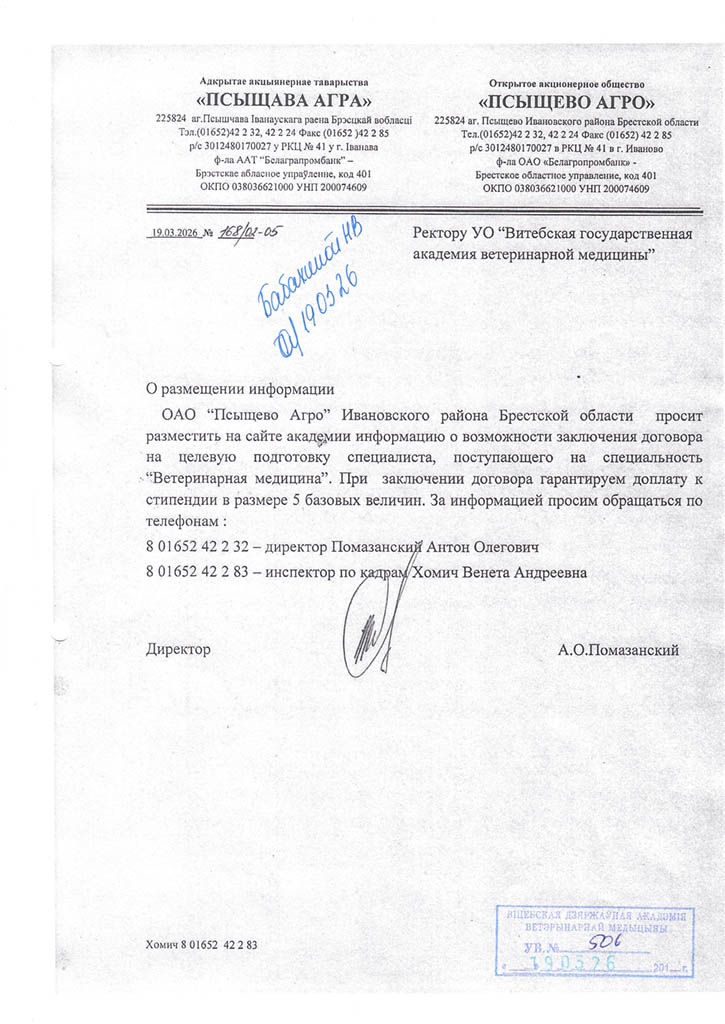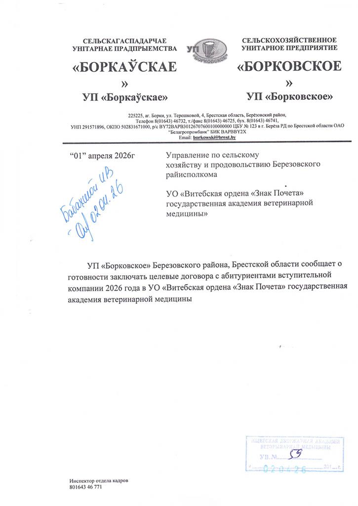 Районные (городские) призывные комиссии решение о призыве на срочную военную службу или службу в резерве молодых специалистов (рабочих, служащих), направленных на работу в организации агропромышленного комплекса Витебской области в соответствии с договором о целевой подготовке специалиста (рабочего, служащего), принимают с учетом ходатайства Витебского облисполкома о призыве таких специалистов (рабочих, служащих) на службу в резерве (Указ Президента Республики Беларусь от 25.02.2020 №70 «О развитии агропромышленного комплекса в Витебской области»).