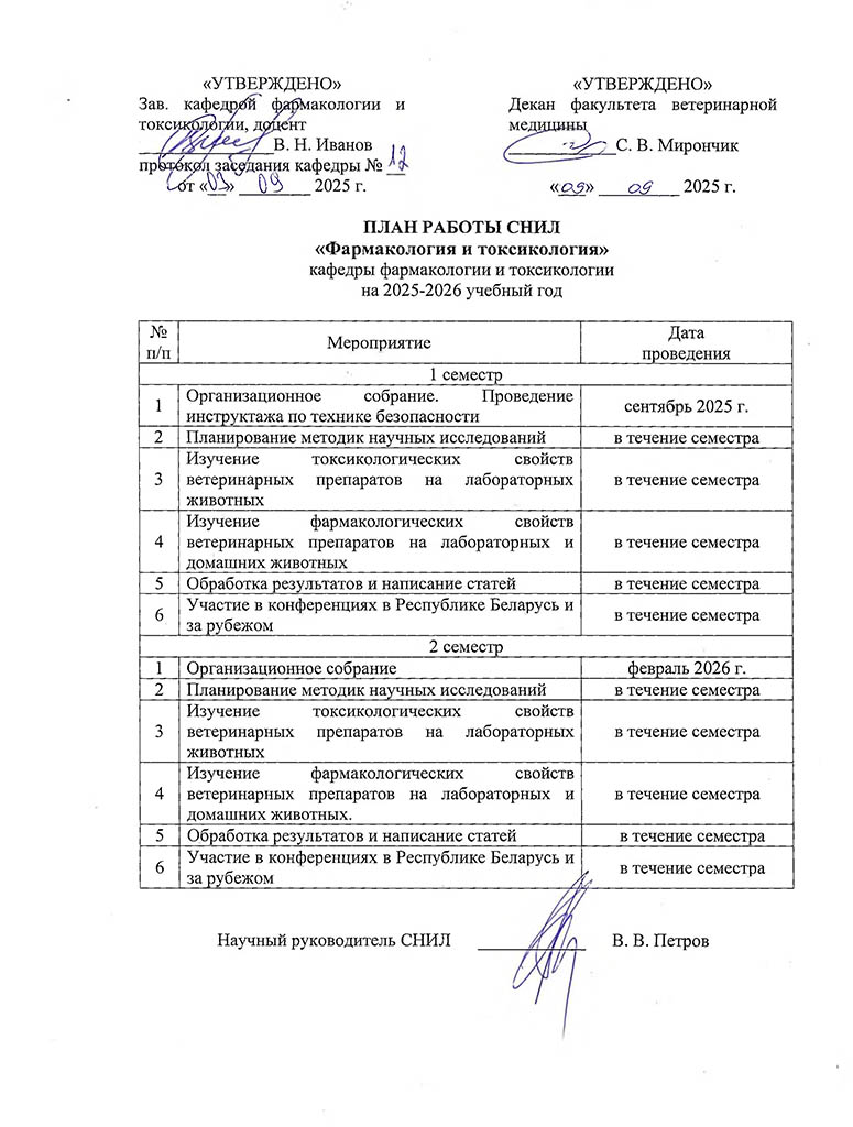 Студенческий научный кружок работает в соответствии с планом, утверждаемым на учебный год. План работы СНК составляется научным руководителем СНК, утверждается на заседании кафедры фармакологии и токсикологии и деканом факультета ветеринарной медицины.