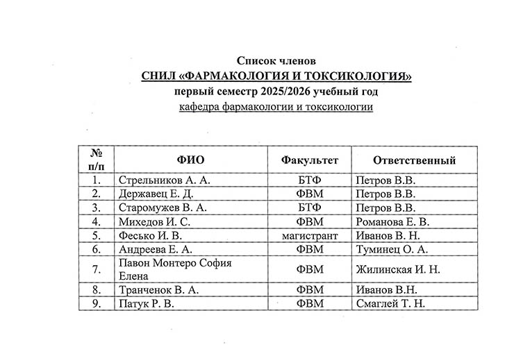 Членами СНК «Фармакология и токсикология» может быть каждый студент и магистрант УО ВГАВМ, регулярно участвующий в научно-исследовательской работе СНК кафедры.