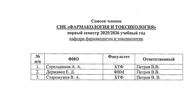 Научное руководство СНК «Фармакология и токсикология» осуществляет кандидат ветеринарных наук, доцент кафедры фармакологии и токсикологии – Петров Василий Васильевич.